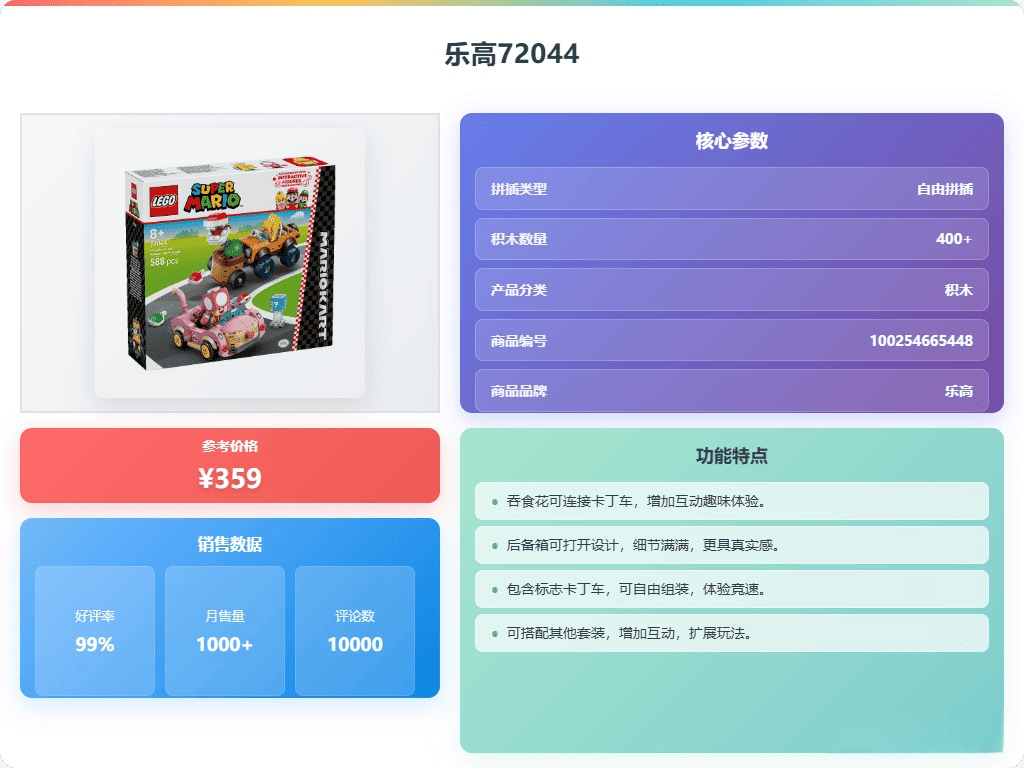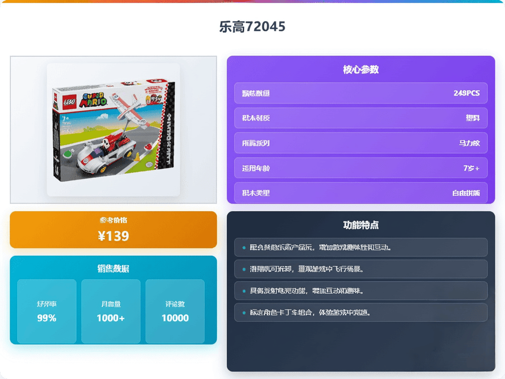 当然,除了情怀和互动性,还得考虑耐玩度。别买那种华而不实,玩两天就坏的。乐高在这方面做得不错,质量有保证,而且很多套装都支持多人合作和创意拼搭,比如乐高72045,可以单人创意拼搭,也能和朋友一起挑战,还能结合APP获得拼装灵感。再说了,丰富的动作体验也很重要!像发射龟壳、漂移、滑翔这些经典动作,加上声音和视觉效果,玩起来才过瘾!还有乐高72032,卡丁车造型酷炫,滑翔翼可拆卸,还有发射装置,这些小细节都能增加趣味性。