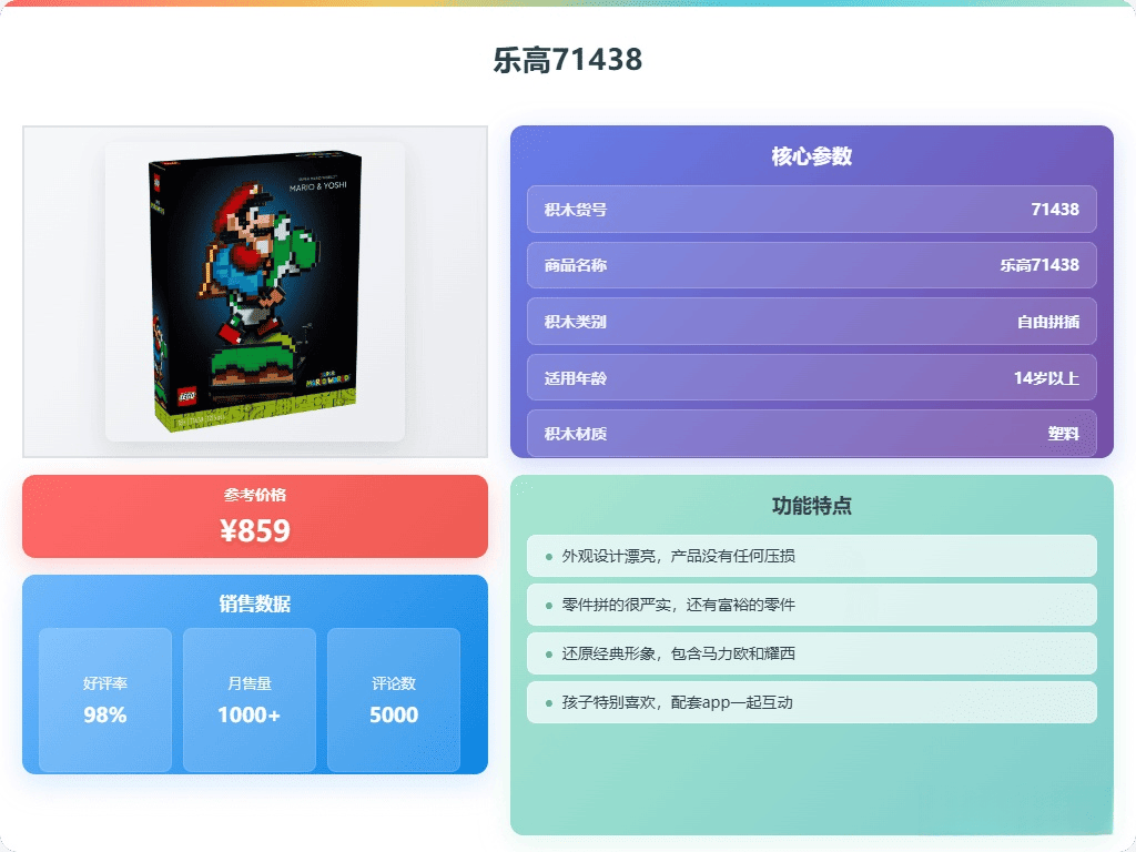 ▶还原经典形象:这款乐高套装能够帮助孩子重现超级马力欧的经典场景,马力欧和耀西的模型都非常逼真,让人一看就能回想起童年的游戏记忆。