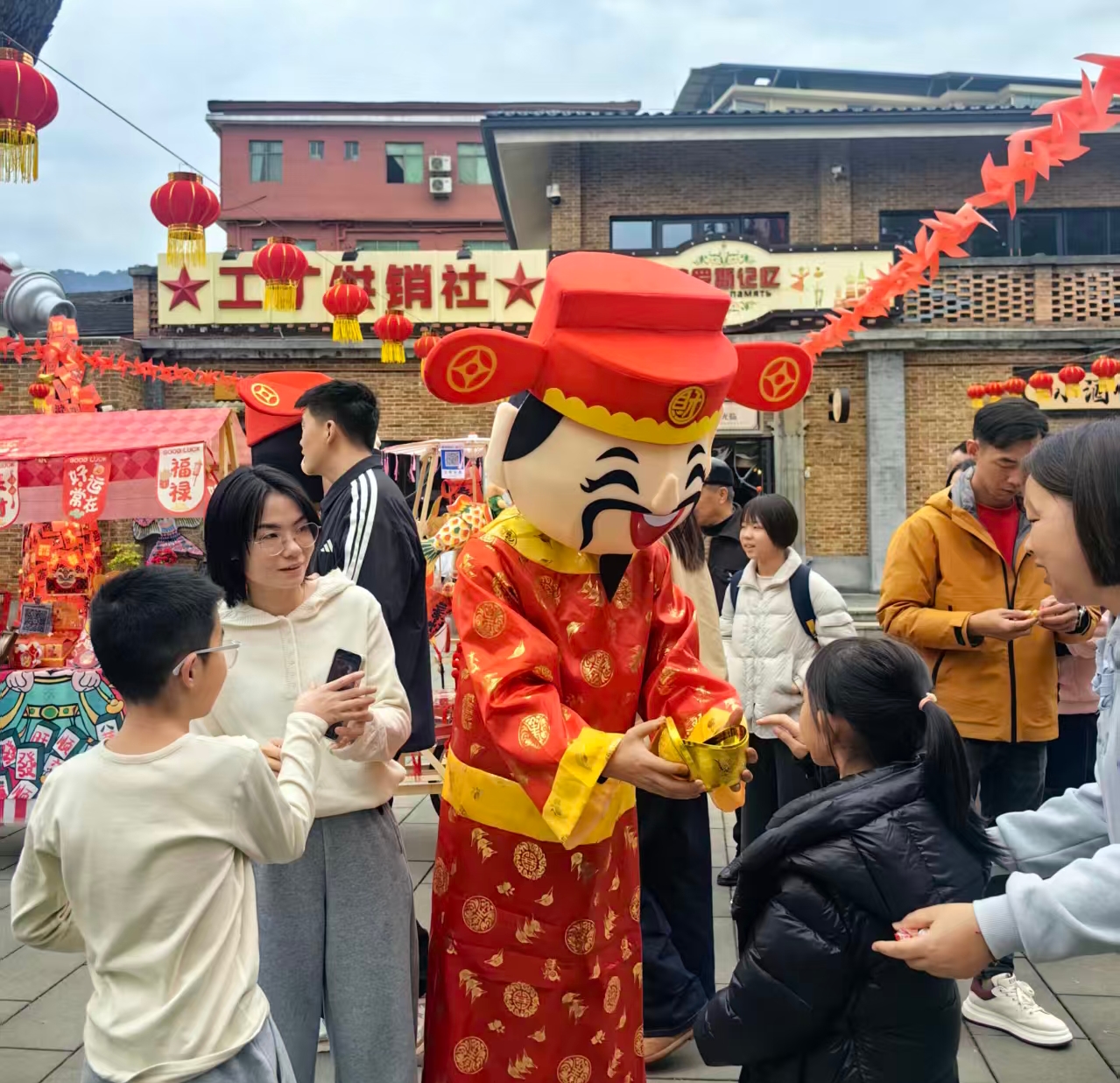 财神等NPC和挑着担子的货郎穿梭在人群中,不时为小朋友们送上寓意吉祥的“福”字和糖果。主舞台上,主持人正带领游客进行趣味互动游戏,欢笑声、加油声此起彼伏。